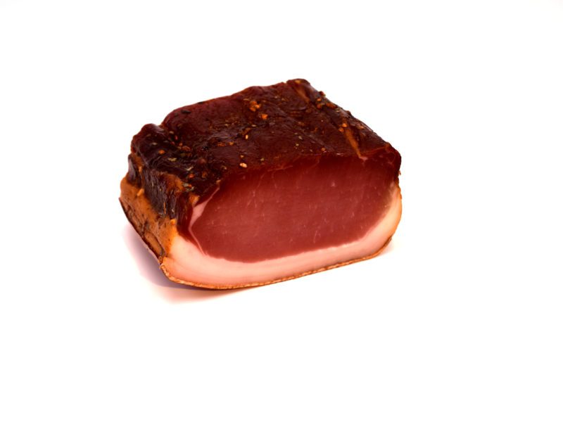 Der Bauernspeck wird aus Schweinebauch ohne Knochen mit Salz, Knoblauch und Naturgewürzen im Bottich gesurt. Räucherung bei 25 Grad, mild würziges Raucharoma.